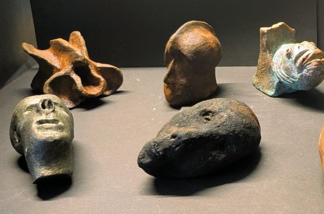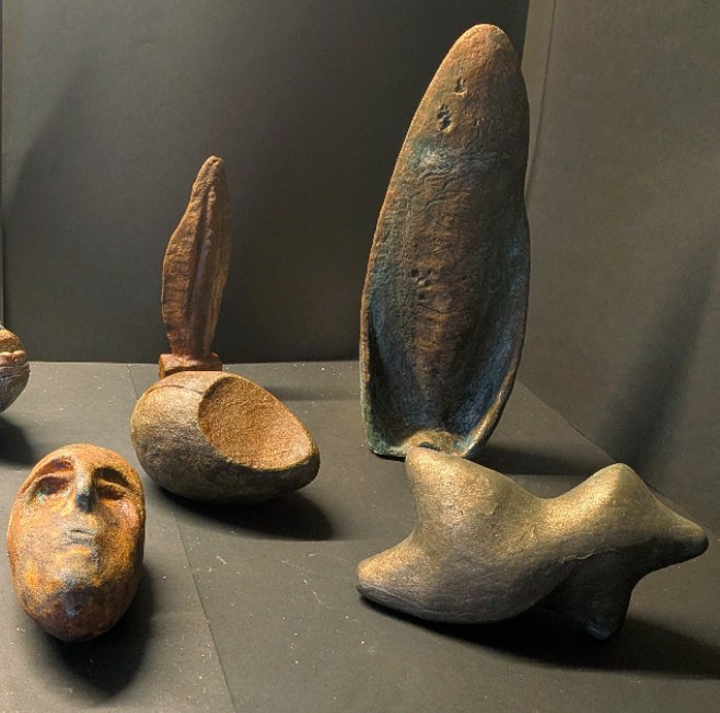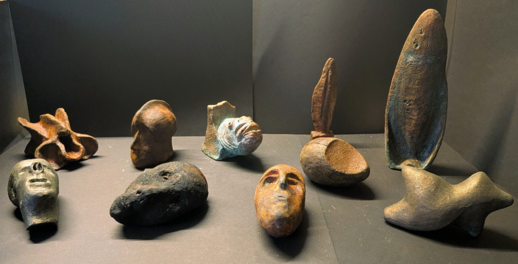 Zur Zeit überarbeite ich die Oberflächen einiger Ton-Maquetten, die mir teilweise als Ideengeber für die Umsetzung in Stein dienten. Es ist sozusagen eine Zweitverwertung, durch die ihre dienende Funktion zugunsten einer eigenen Ästhetik ersetzt wird. Dazu werden die Tonplastiken patiniert, d.h. zunächst mit Primer grundiert, danach mit Metalllegierungen (Silber, Kupfer bzw. Eisen) belegt und diese anschließend mit Oxydationsmittel benetzt. Je nach Dauer und Intensität entstehen Färbungen mit unterschiedlichen Verläufen, die die ursprüngliechen Maquetten als autonome Kleinplastiken erscheinen lassen.
